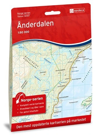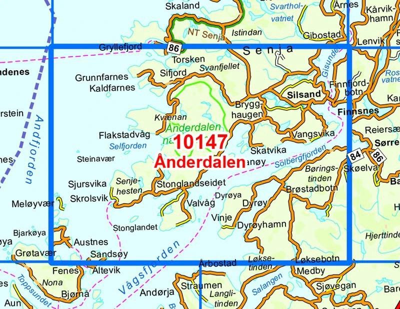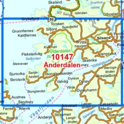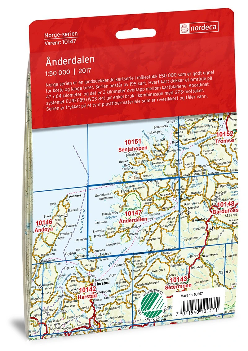 Carte topographique, de randonnĂ©e et de plein air du sud de lâĂźle de Senja en NorvĂšge. Echelle 1:50 000. ĂditĂ©e par Nordeca. SĂ©rie Norge n°10147.