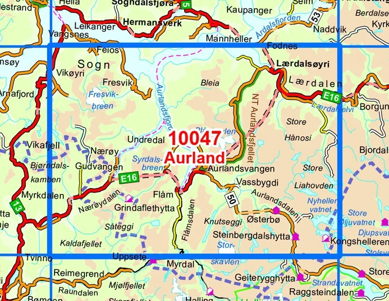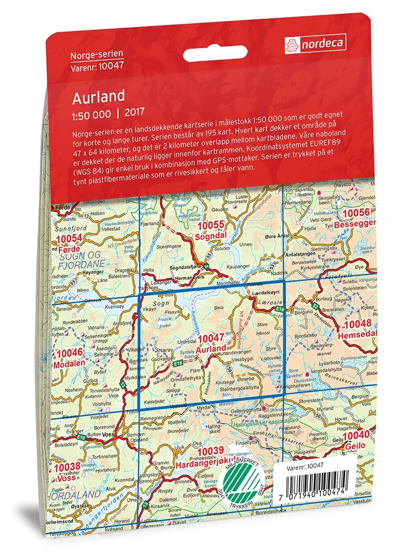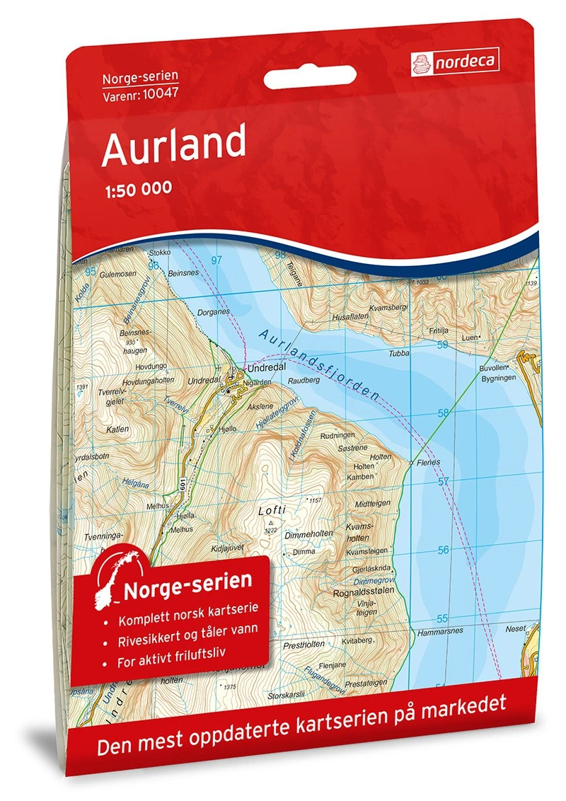Carte topographique Aurland au 1:50 000 éditée par Nordeca, série Norge-serien. Numéro de carte 10047.