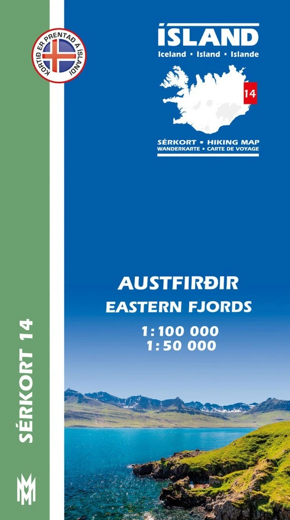 Carte de randonnée Austfirdir au 1:100 000 s’étendant dans la partie est de l’Islande, au niveau des fjors. La carte montre les principales routes, pistes et chemins de randonnée ainsi qu’un grand nombre d’autres informations utiles : refuges et abris, terrains de camping…