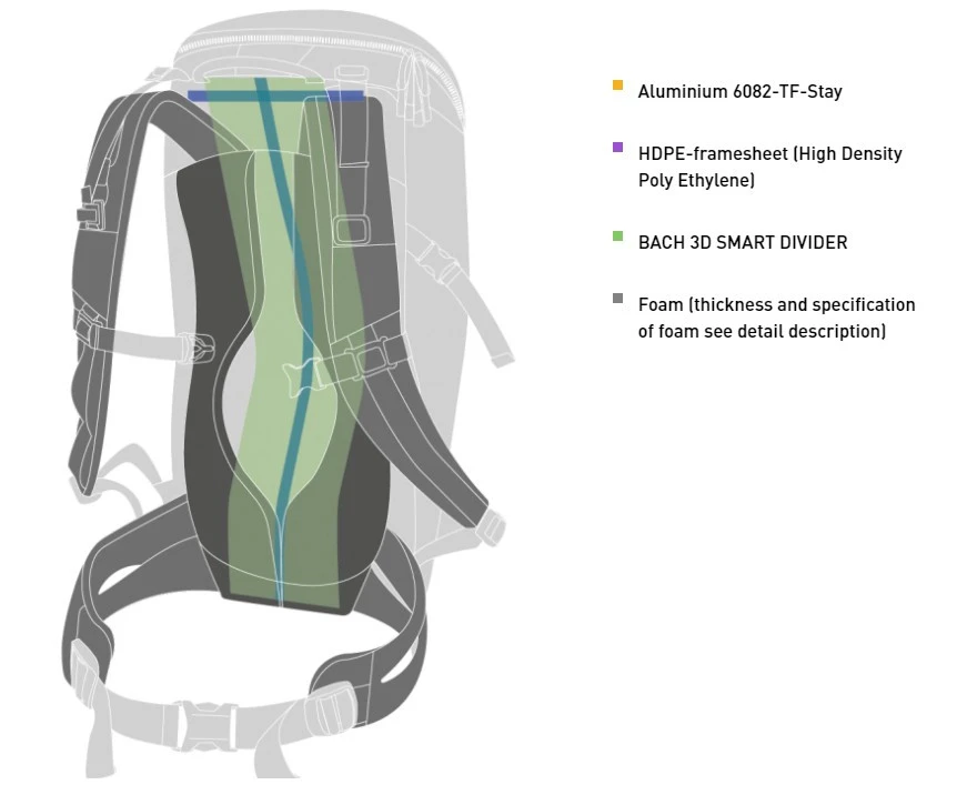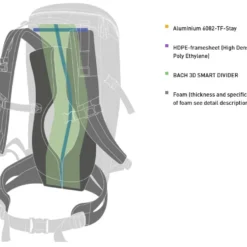 Le dos est Ă©quipĂ© du systĂšme de portage Shield de Bach. Celui-ci est optimisĂ© pour rester confortable jusquâĂ une charge de 15 kg. Il offre ventilation, confort de portage et lĂ©gĂšretĂ©. Il est composĂ© dâun rail en aluminium et dâune plaque dorsale en HDPE (polyĂ©thylĂšne haute densitĂ©), lĂ©gĂšrement courbĂ© pour assurer rigiditĂ© et aĂ©ration, ainsi quâun filet tendu et de mousse EVA pour assurer le confort. Les bretelles et les hanches sont Ă©galement rembourrĂ©es avec de la mousses EVA.