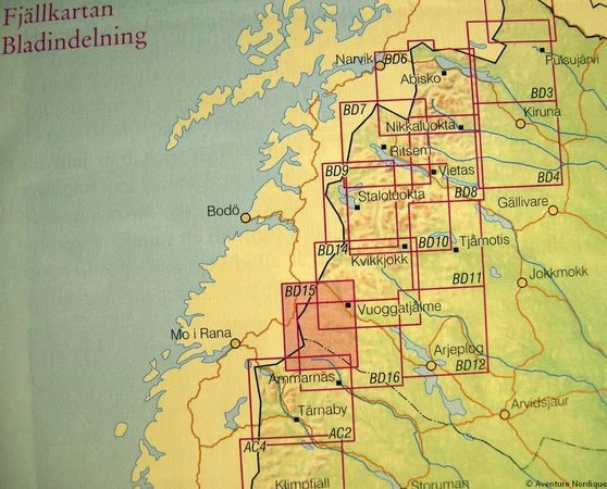 Carte BD15 NasafjĂ€llet, de randonnĂ©e et de plein air. La carte couvre quelques kilomĂštres entre Adolfström et AmmarnĂ€s, sur lâitinĂ©raire de la Kundsleden Sud, ainsi quâune partie du parc national norvĂ©gien Saltfjellet â Svartisen. La carte BD15 NasafjĂ€llet est compatible avec le systĂšme GPS (grille Sweref 99 TM).
