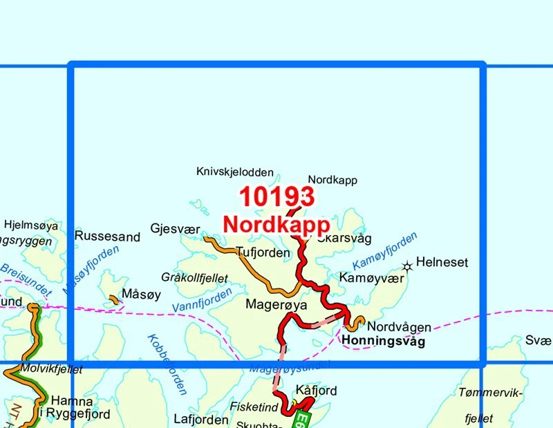 Découvrez la partie la plus au nord de NorvÚge ! La carte couvre ces lieux : GjesvÊr, Helnes, HonningsvÄg, KamÞyvÊr, Knivskjelodden, Kobbefjorden, MagerÞya, MagerÞysundet, MÄsÞy, Nordkapp, SkarsvÄg, Valan.