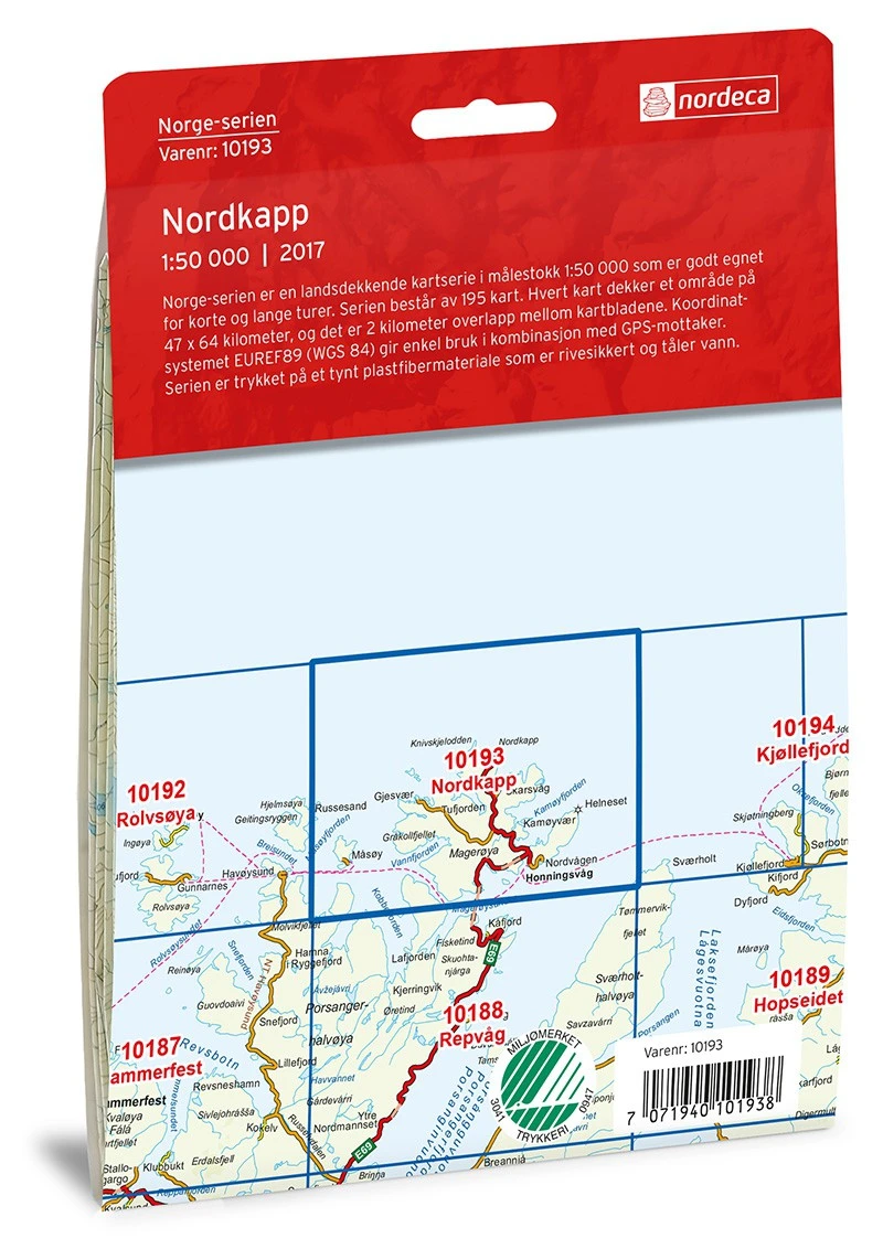 La carte de randonnĂ©e Nordkapp couvre le point le plus septentrional de NorvĂšge : le Cap Nord ! Cette carte Ă l’Ă©chelle 1:50 000 couvre les Ăźles de MagerĂžya et de Nordkapp-halvĂžya et les communes de HonningsvĂ„g, KamĂžyvĂŠr, SkarsvĂ„g, GjesvĂŠr. Carte compatible avec les GPS (grille UTM). LĂ©gende en anglais. Papier rĂ©sistant Ă lâhumiditĂ©.