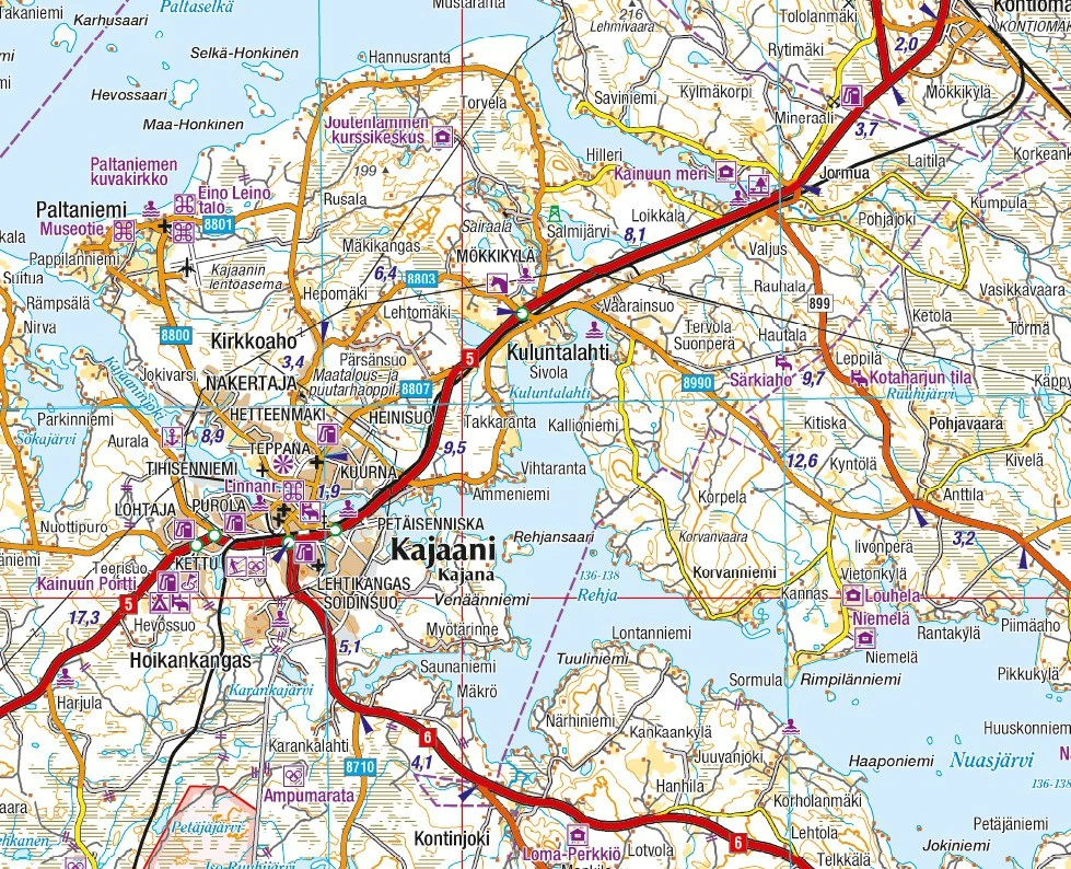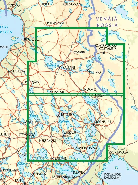 La GT Tierkartta Itä-Suomi est la carte routière au 1 : 250 000 de l’est de la Finlande. Cette carte recto-verso couvre la partie orientale de la Finlande ainsi que la zone frontière avec la Russie. Elle s’étend au nord jusqu’à Suomussalmi et au sud jusqu’à la ville de Mikkeli. La carte contient l’ensemble des routes de la partie orientale de la Finlande ainsi que des indications touristiques. Légende en anglais.