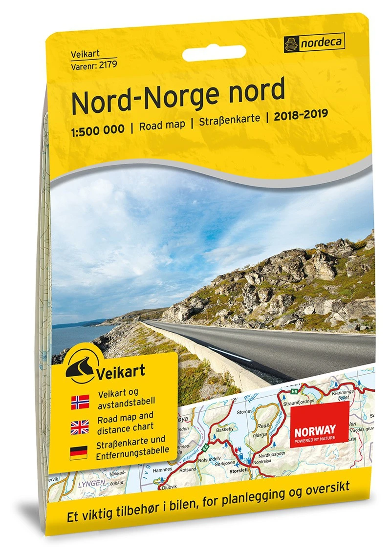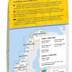 La Veikart Nord-Norge Nord des éditions Nordeca est un coffret qui contient une carte routière qui couvre l’extrême nord de la Norvège et un index avec le nom des localités. Cette carte s’étend de Tromsø au sud jusqu’ à Vadsø au Nord. Elle couvre la région du Finnmark et les villes deTromsø, Alta et Vadsø. Echelle au 1:500 000.