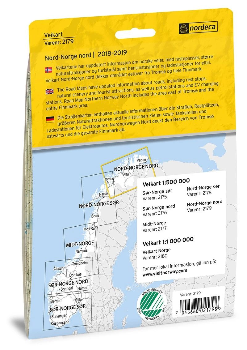 La carte routière n° 2179 Veikart Nord-Norge Nord contient de nombreuses indications touristiques permettant de préparer un voyage en Norvège et de s’orienter sur place : routes, campings et hébergements, lieux d’intérêts touristiques, stations essence… Légende en anglais et index des communes.