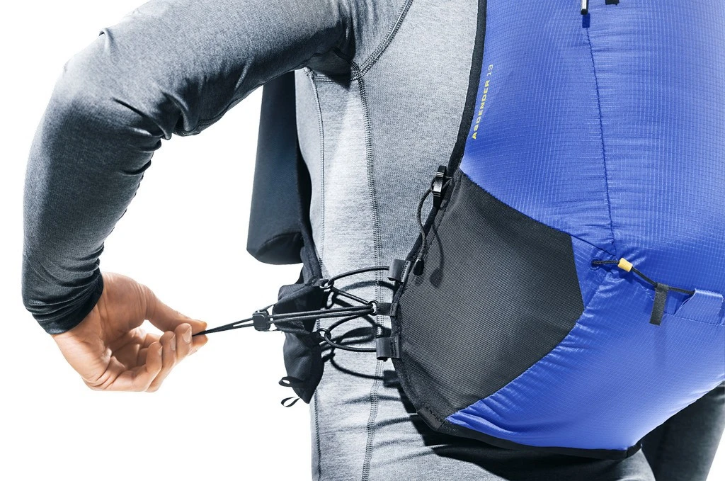 A lâextĂ©rieur du sac, sur les deux bretelles, se trouvent des poches Ă gourdes souples, une poche porte-bĂątons combinĂ©e Ă un serrage Ă©lastique et sous le bras gauche, une poche en tissu mesh zippĂ©e pour un tĂ©lĂ©phone ou un snack. Sur les cĂŽtĂ©s, deux petites poches latĂ©rales Ă©lastiques viennent complĂ©ter lâensemble.