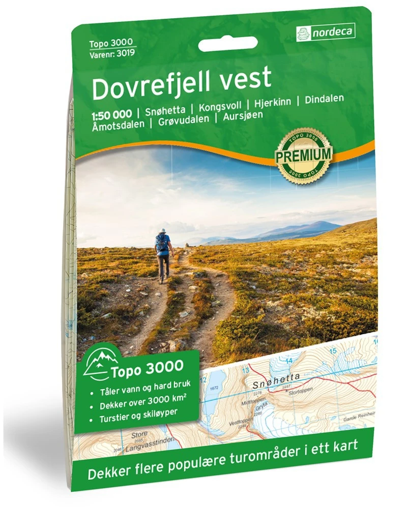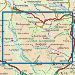 La carte Dovrefjell Vest au 1:150 000 couvre les lieux suivants : SnĂžhetta – Kongsvoll – Hjernkinn – Dindalen – Ă motsdalen – GrĂžvudalen – AursjĂžen. Cette carte de randonnĂ©e couvre plus de 3000 kmÂČ. Elle dĂ©taille les sentiers de randonnĂ©e ainsi que les refuges.