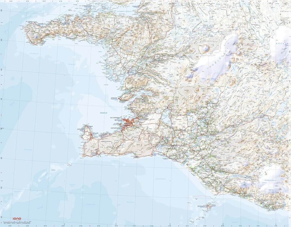 Carte touristique Ferdakort n°2 Sudvesturland du sud-ouest de lâIslande. Echelle au 1:250 000. La carte en papier pliĂ©e couvre la pĂ©ninsule de SnĂŠfellsnes, la rĂ©gion de KeflavĂk et la capitale ReykjavĂk ainsi que les calottes glaciaires du sud de lâIslande : lâEyjafjallajökull et le MĂœrdalsjökull. La carte Ferdakort 2 permet de visualiser lâarchipel des Ăźles Vestmann (Vestmannaeyjar) et les hautes terres recouvertes par le glacier Langjökull et une partie du Hofsjökull.