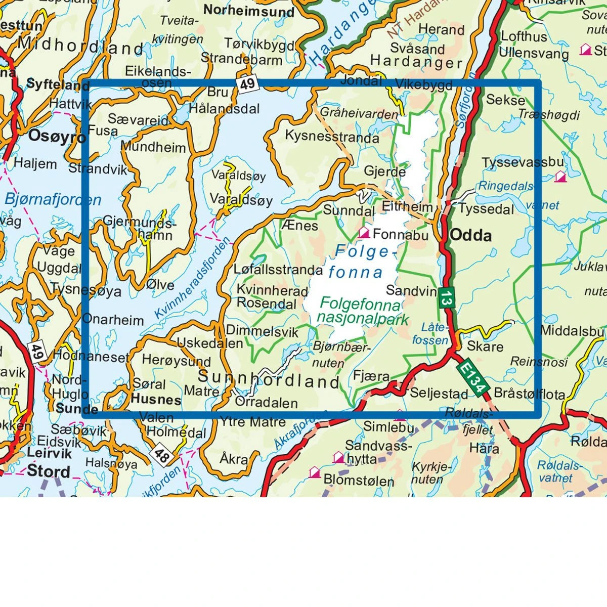 La carte de randonnĂ©e Folgefonna Nasjonalpark couvre le parc national et le glacier du Folgefonna, ainsi qu’une une partie du fjord Hardangerfjorden. La carte permet de visualiser les destinations suivantes : Odda, Tyssedal, Trolltunga, Kvinnherad, Rosendal, Uskedalen. Les refuges prĂ©sents sur la carte : Breidablik, Fonnabu, Holmaskjerbu, Mosdalsbu, Simlebu, Sauabrehytta, KvanntjĂžrnsbu. Carte recto-verso au 1 :50 000. LĂ©gende en anglais. La carte est compatible GPS (WGS84).