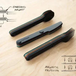 Le Magware de la marque californienne Full Windsor est un ensemble de couverts : couteau, fourchette et cuillĂšre. LittĂ©ralement âvaisselle magnĂ©tiqueâ, il sâagit dâun jeu de couverts qui sont reliĂ©s entre eux par un systĂšme magnĂ©tique. Ils sont ainsi faciles Ă regrouper et Ă ranger.