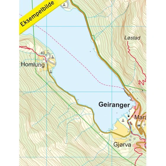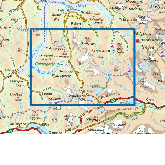 Carte de randonnĂ©e, de trekking et de plein air, couvrant le fjord Geirangerfjorden. Cette carte dĂ©taillĂ©e couvre plus de 750kmÂČ. Vous trouverez les sentiers de randonnĂ©e et les hĂ©bergements clairement identifiĂ©s sur la carte.