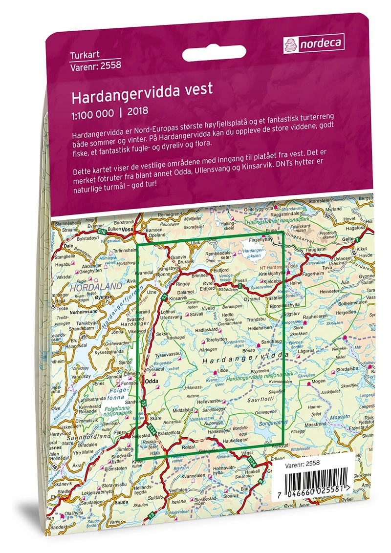 La carte de randonnĂ©e Hardangervidda au 1 :100 000 couvre la partie est du plateau Hardanger. La carte permet de visualiser Ă lâouest : Odda, les fjords SĂžrfjorden, Hardangerfjorden, eidfjorden. Au nord : le glacier HardangerjĂžkulen, Geilo. Au sud Haukeliseter et Rjukan. Elle couvre les lieux suivants : Brimnes, Bruravik, Eidfjord, Eidfjorden, Finse, Granvin, Hallingskarvet, Hardanger, Hardangerfjorden, HardangerjĂžkulen, Hardangervidda, Hardangervidda nasjonalpark, Haukelifjell, HĂ„rteigen, Kinsarvik, Kvanndal, Kvennedalen, Lofthus, MĂ„bĂždalen, NordmannslĂ„gen, Odda, RĂžldal, Sandfloegga, Songavatnet, SĂžrfjorden, Tyssedal, Ullensvang, Ulvik, Utne, Veig, VĂžringsfossen.