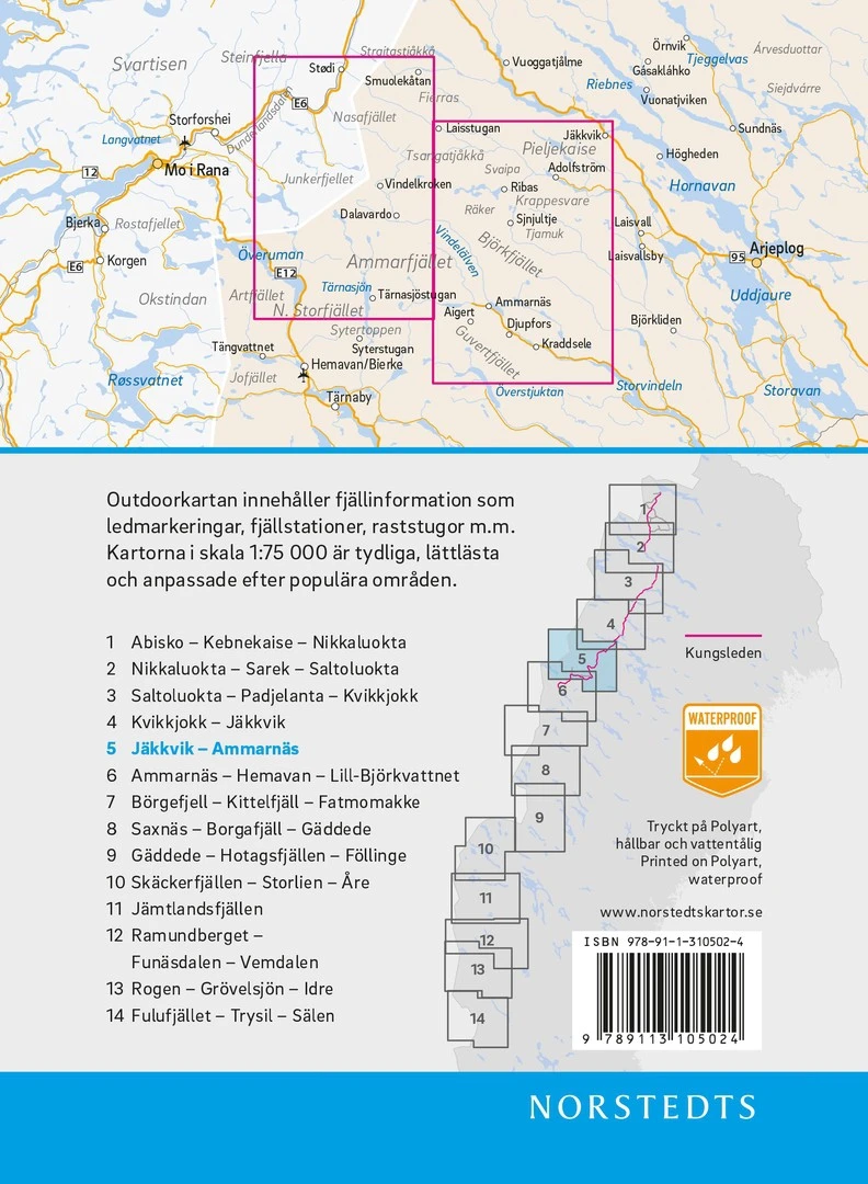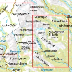 Jäkkvik – Ammarnäs fait partie de la nouvelle série des cartes topographiques Outdoorkarten de l’éditeur suédois Norstedts. La zone de couverture est adaptée à la randonnée en montagne et pour les sports de plein air et les activités outdoor : canoë, patinage, ski de randonnée nordique, etc…. Carte à l’échelle 1:75 000. La carte indique les sentiers d’été et les itinéraires hivernaux, ainsi que les refuges gardés ou non gardés.