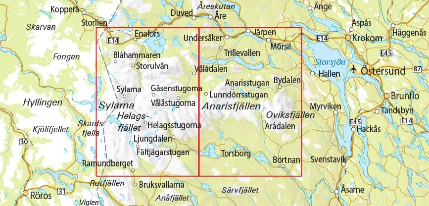 Jämtlandsfjällen fait partie de la nouvelle série des cartes topographiques Outdoorkarten de l’éditeur suédois Norstedts. La zone de couverture est adaptée à la randonnée en montagne et pour les sports de plein air et les activités outdoor : canoë, patinage, ski de randonnée nordique, etc…. Carte à l’échelle 1:75 000. La carte indique les sentiers d’été et les itinéraires hivernaux, ainsi que les refuges gardés ou non gardés.