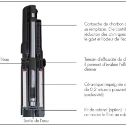 La cartouche filtrante en cĂ©ramique imprĂ©gnĂ©e dâargent Ă©limine les bactĂ©ries, les kystes et les sĂ©diments. Elle est nettoyable. Les granulĂ©s de charbon actif prĂ©sents dans le filtre rĂ©duisent la teneur en substances chimiques et amĂ©liorent le goĂ»t de lâeau.
