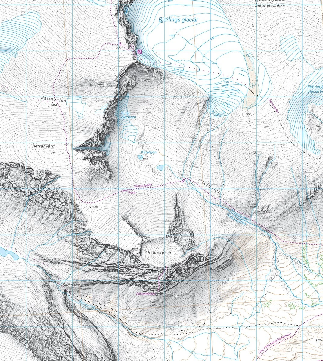 Carte précise au 1:15 000 des montagnes du Kebnekaise. Couvre les lieux suivants : Drakryggen, Gaskkasbåkti, Lillietoppen, Tarfala, VÀstra och östra leden, Duolbagorni, Silverfallet.