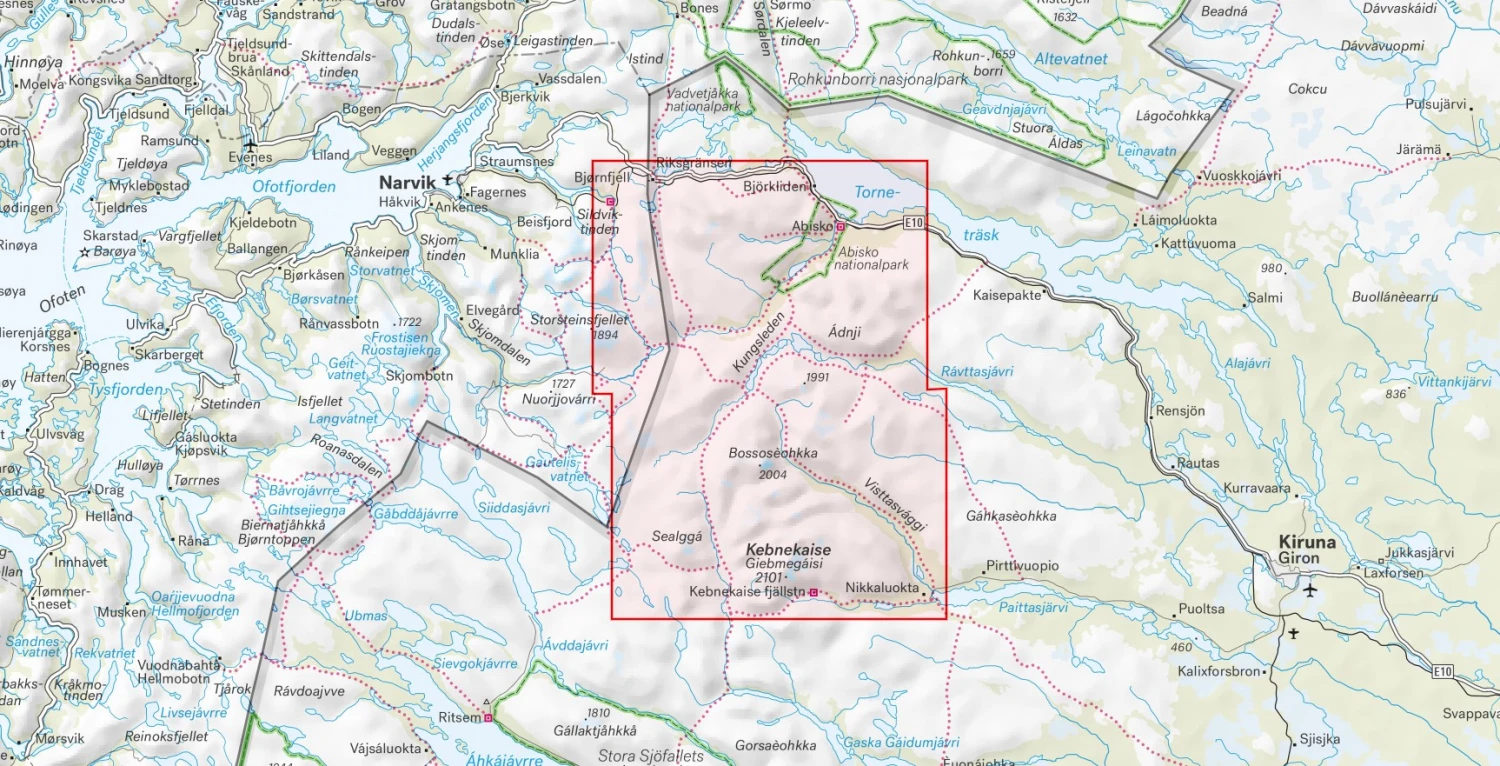 Cette carte couvre la partie nord de la Kungsleden, d’Abisko à Nikkaluokta ainsi que les lieux suivants : Björkliden, Låktajåkka, Alesjaure, Mårm, Vistas, Nallo, Tjäktja, Singi, Sälka, Tarfala.