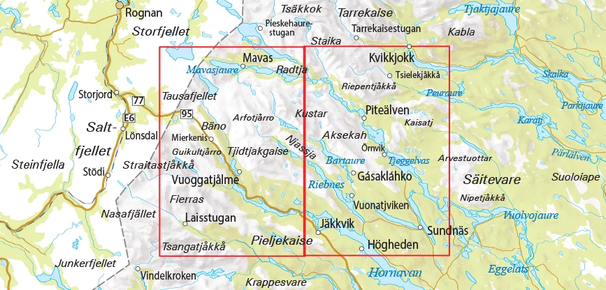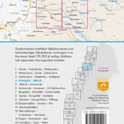Carte dédiée aux activités de plein air. Couvre le secteur Kvikkjokk – Jäkkvik 1:75 000.