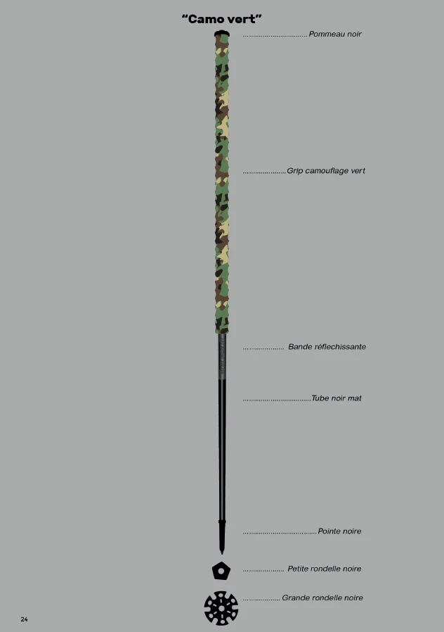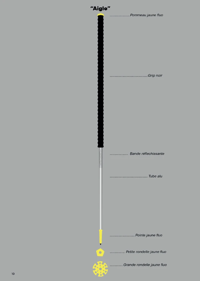 Ce sont des bâtons en un seul brin (pas de réglage, ni d’entretien), en aluminium 7075 anodisé de 18 mm de diamètre (solide). Ils sont dotés d’un long grip ergonomique en mousse EVA de 24 à 28 mm de diamètre d’une longueur de 70 cm. Ils sont livrés avec 2 rondelles interchangeables par simple vissage et dévissage : 1 petite rondelle de 38 mm pour les terrains secs et 1 grande rondelle pour les terrains enneigés (la poudreuse, la peuf, la fraiche, la blanche !).