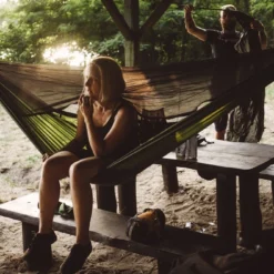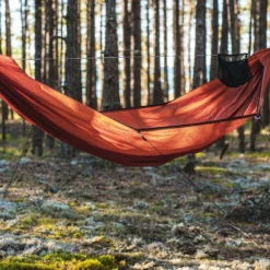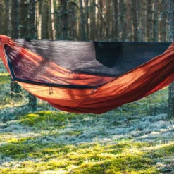 Le hamac est fabriquĂ© en nylon Ripstop durable, rĂ©sistant et supportant jusquâĂ 250 kg, tout en restant lĂ©ger et entiĂšrement respirant.