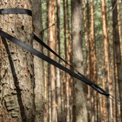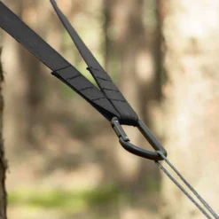 Les lignes Dyneema sont attachĂ©es Ă des mousquetons et Ă des sangles de type « ceinture de sĂ©curité » de voiture en polyester qui sâenroulent autour dâun arbre. Ces sangles sont fiables et solides pour suspendre votre hamac et nâendommagent pas lâĂ©corce des arbres.