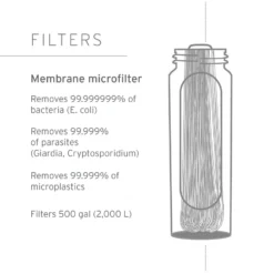 Ce filtre Ă eau, par gravitĂ© est composé d’une membrane Ă fibres creuses de 0,2 microns qui Ă©limine 99,9999 % des bactĂ©ries (E.Coli, cholera, salmonelleâŠ) et 99,99 % des parasites protozoaires (giardia, cryptosporidieâŠ) et 99,999 % des microplastiques, du limon, du sable pouvant contaminer lâeau.