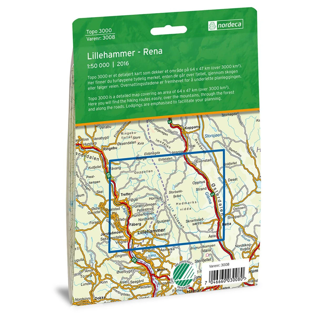 La carte Lillehammer-Rena au 1:50 000 couvre plus de 3000 kmÂČ de territoire norvĂ©gien. Elle permet de visualiser les lieux suivants : Krokbua, Pellestova, Skolla, BĂ„sstĂž, Djupslia, Bulonhytta, Steinhytta, Skjelbua, VetĂ„bua, SandflĂžten, Halgutusveen, Ă kersĂŠtra, Nordlandia Ăsterdalen, Godlidalshytta.
