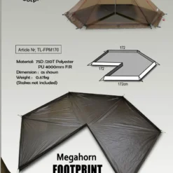 Le Footprint Megahorn est un tapis de sol spĂ©cialement conçu pour les tipis Megahorn II et Megahorn III de la marque Luxe Outdoor. Il remonte de quelques centimĂštres sur le pourtour empĂȘchant toute infiltration dâeau. Il sâutilise avec le tipi seul et son mĂąt, mais sans la chambre. Il est compatible avec un poĂȘle Ă bois.
