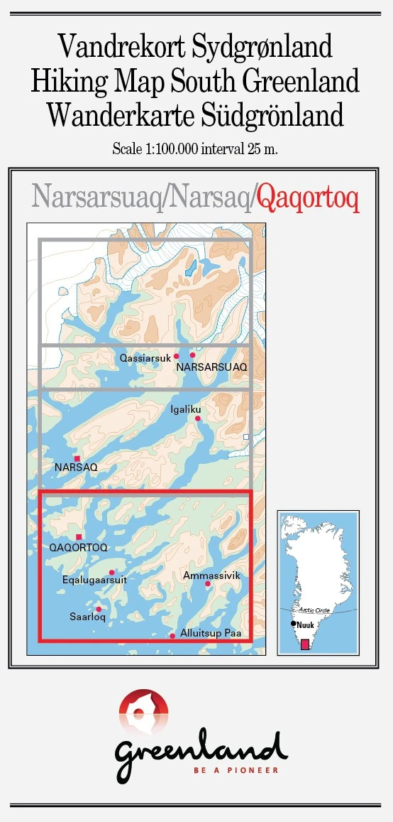 Carte de randonnée et de plein air de Qaqortoq et de ses environs. Echelle au 1 :100 000. La carte comprend des courbes de niveaux tous les 25m. Les sentiers de trekking sont indiqués. Au verso, plan de Qaqortoq, informations touristiques en anglais et idées de randonnées à pied.