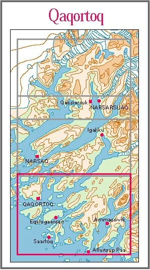 Qaqortoq – Carte de randonnĂ©e n°3 du Groenland. EditĂ©e par Greenland Tourism. Carte topographique, Ă©chelle 1 :100 000, intervalles de 25m