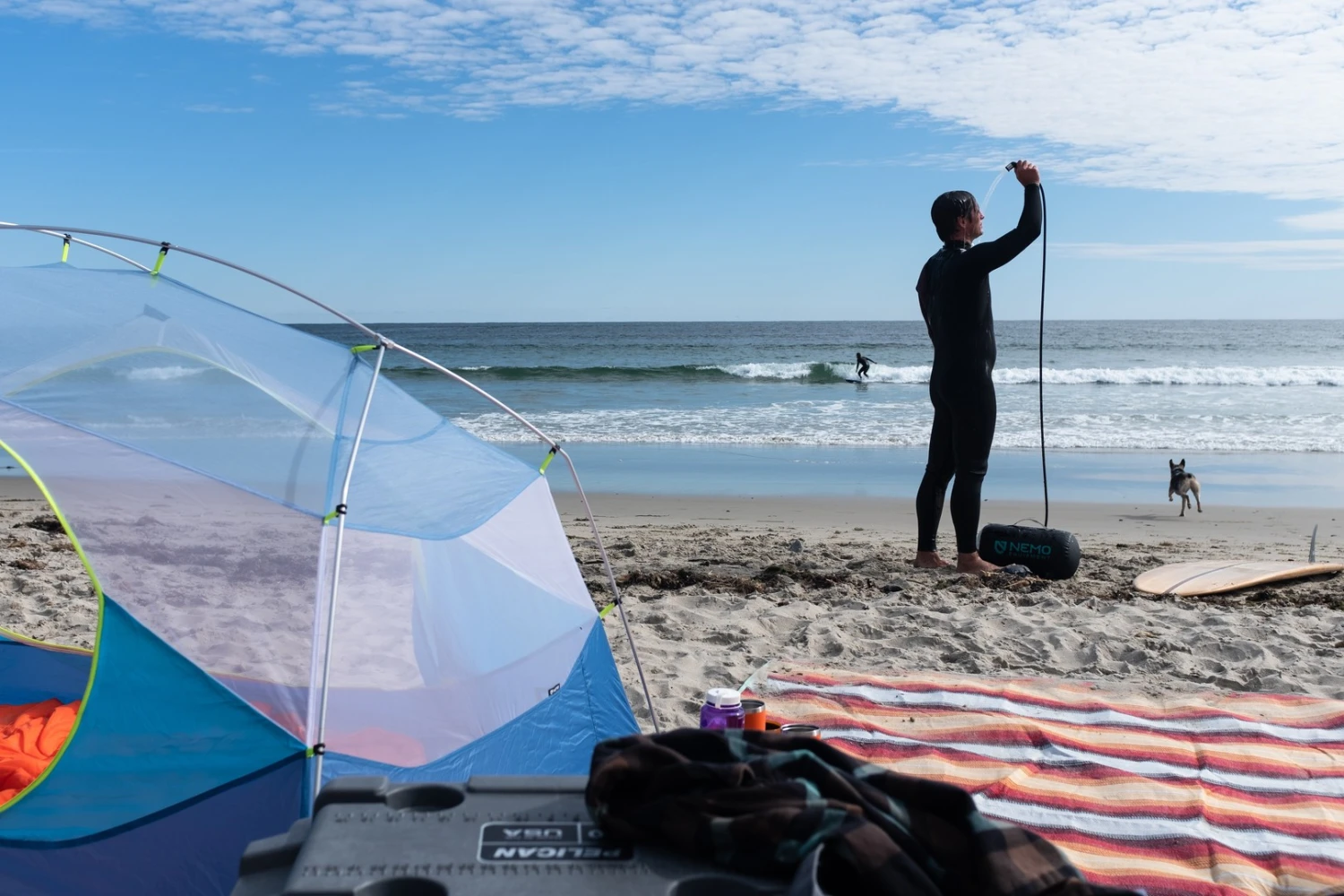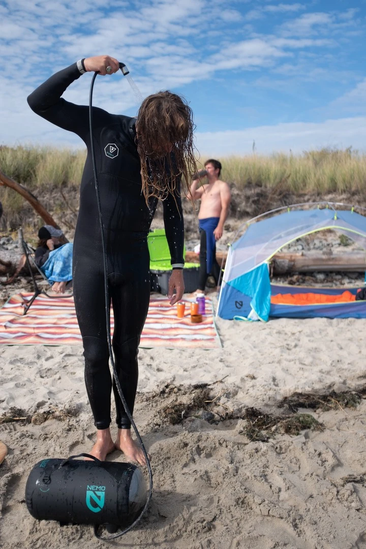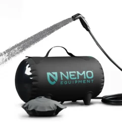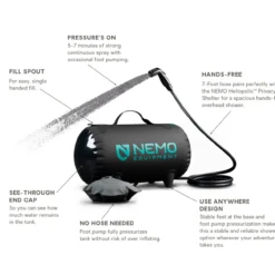 LâHelio Pressure Shower de Nemo est une douche portative dotĂ©e dâun rĂ©servoir de 11 litres. Contrairement aux douches qui se suspendent, lâHelio tient sur ses pieds, Ă l’horizontale, car elle est Ă©quipĂ©e dâun dispositif qui met lâeau sous pression. Le principe est simple : aprĂšs avoir rempli le rĂ©servoir en eau, il suffit dâactionner plusieurs fois la pompe Ă pied afin que le rĂ©servoir monte en pression. Ensuite, il suffit dâactionner le pommeau de douche. On obtient alors un jet qui offre entre 5 Ă 7 minutes dâeau ayant un flux constant.