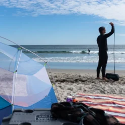 Douche portative pressurisable idéale pour le camping et pour se laver en randonnée.