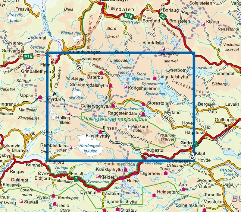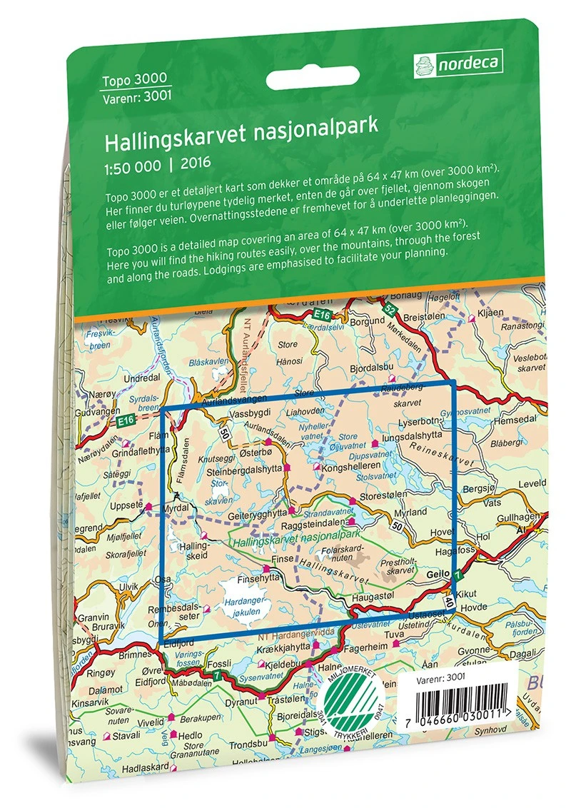 Carte topographique, de randonnĂ©e et de plein air du parc national dâHallingskarvet en NorvĂšge. Echelle 1 :50 000. EditĂ©e par Nordeca. N°3001.