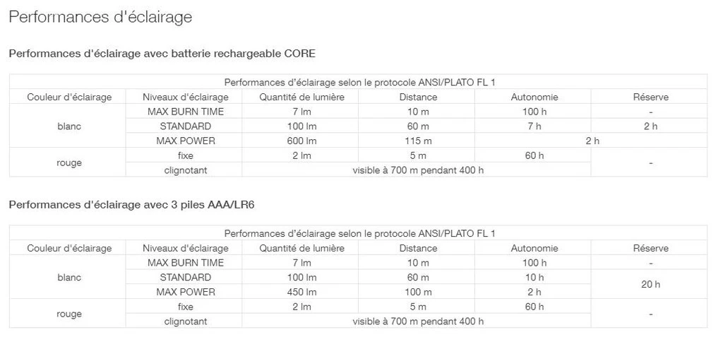 La Actik Core de Petzl est une lampe frontale pour lâĂ©clairage de dĂ©placements, destinĂ©e aux activitĂ©s outdoor comme la randonnĂ©e, le running, l’alpinime.. ou lors de voyages. Elle dispose de 3 niveaux dâintensitĂ© dâĂ©clairage et dâun mode lumiĂšre rouge pour ne pas Ă©blouir. Elle dĂ©livre une puissance maximum de 600 lumens pendant 2 heures (ou 450 lumens avec des piles, non fournie), elle peut Ă©clairer jusquâĂ 115 mĂštres. En mode Ă©conomie dâĂ©nergie, son autonomie passe Ă 100 heures.