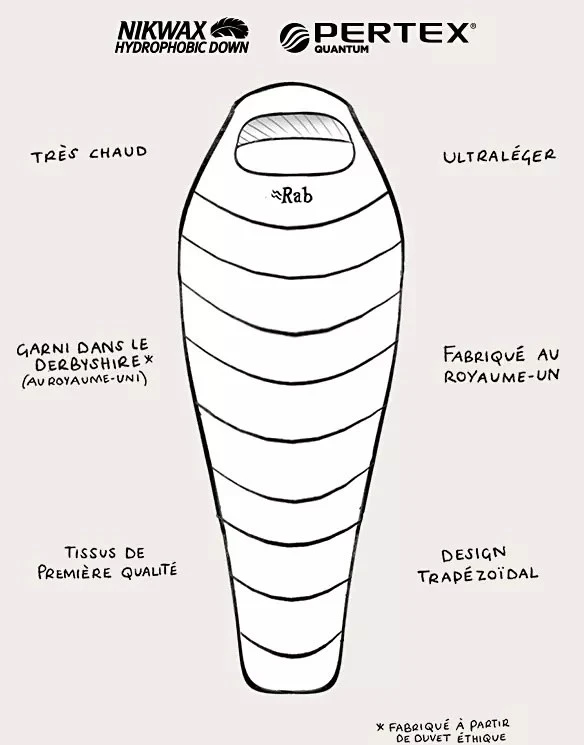 Le sac de couchage Mythic 400 de Rab est garni dâun duvet d’oie europĂ©en hydrophobe certifiĂ© RDS de 900 cuin. Avec sa charge de 400g de duvet, il permet dâobtenir une tempĂ©rature de confort de -1°C. Rab a optimisĂ© son sac de couchage pour obtenir un poids minimaliste de 660 grammes seulement.