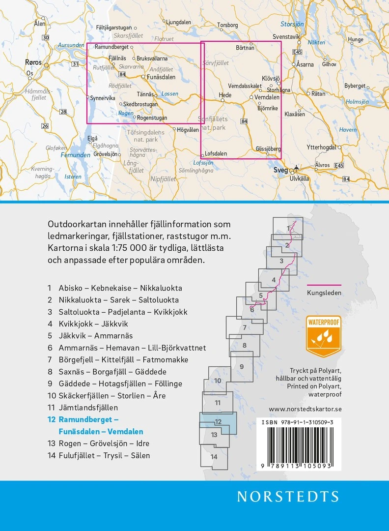 Ramundberget – FunĂ€sdalen – Vemdalen fait partie de la sĂ©rie des cartes topographiques Outdoorkartan de l’Ă©diteur suĂ©dois Norstedts. La zone de couverture est adaptĂ©e Ă la randonnĂ©e en montagne et pour les sports de plein air et les activitĂ©s outdoor : canoĂ«, patinage, ski de randonnĂ©e nordique, etc…. Carte Ă l’Ă©chelle 1:75 000. La carte indique les sentiers d’Ă©tĂ© et les itinĂ©raires hivernaux, ainsi que les refuges gardĂ©s ou non gardĂ©s.