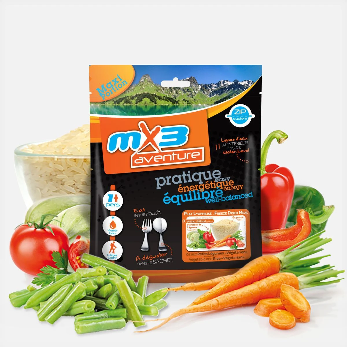 Le Riz aux petits légumes végétarien MX3 est une recette végétarienne, sous forme lyophilisée. Elle associe un onctueux riz à des légumes craquants (tomates, carottes, courgettes, poivrons rouges et verts et haricots verts).
