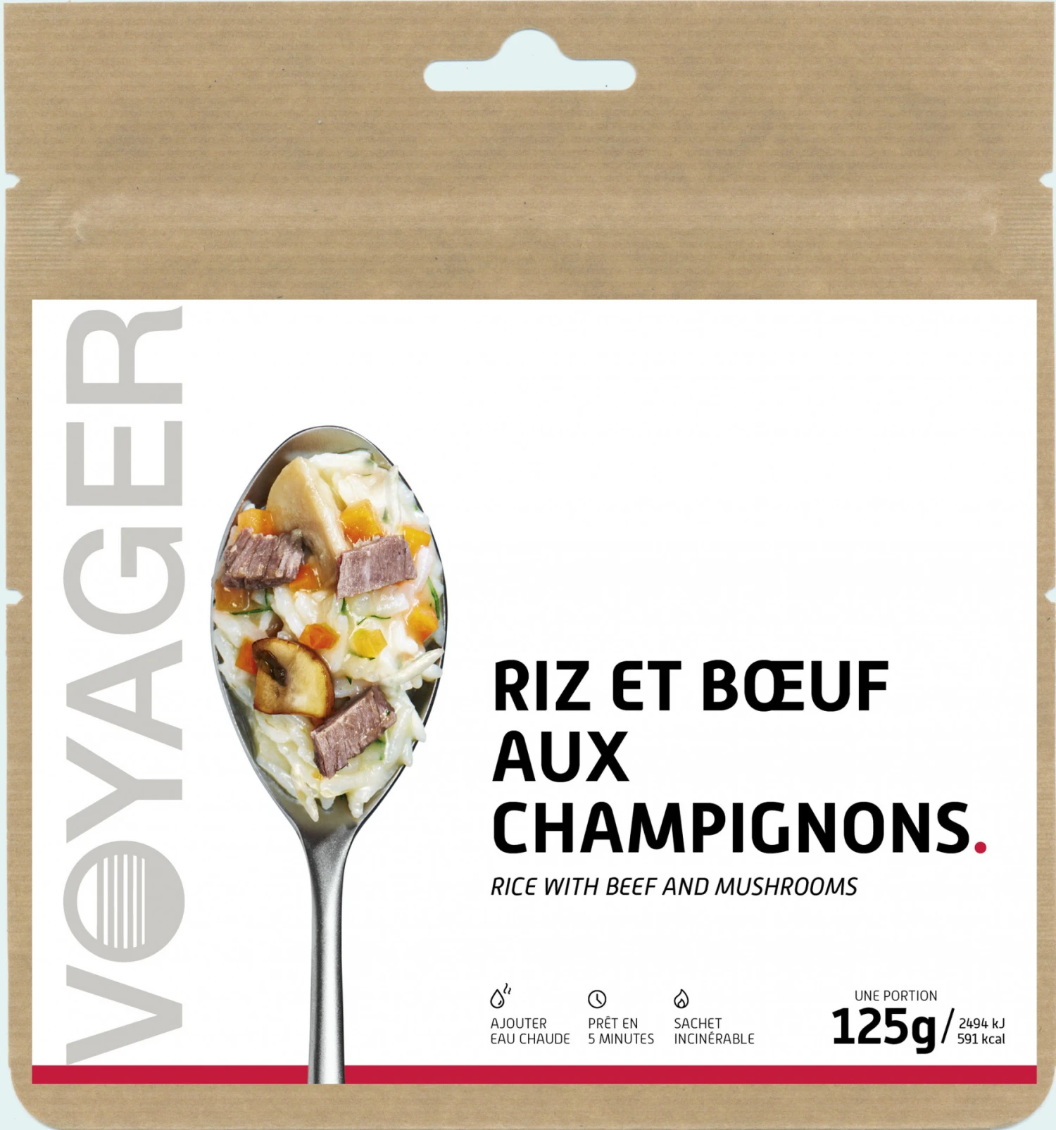 Le Riz et bĆuf aux champignons de Voyager est un plat lyophilisĂ©, associant de tendres morceaux de boeuf Ă du riz et des succulents champignons.
