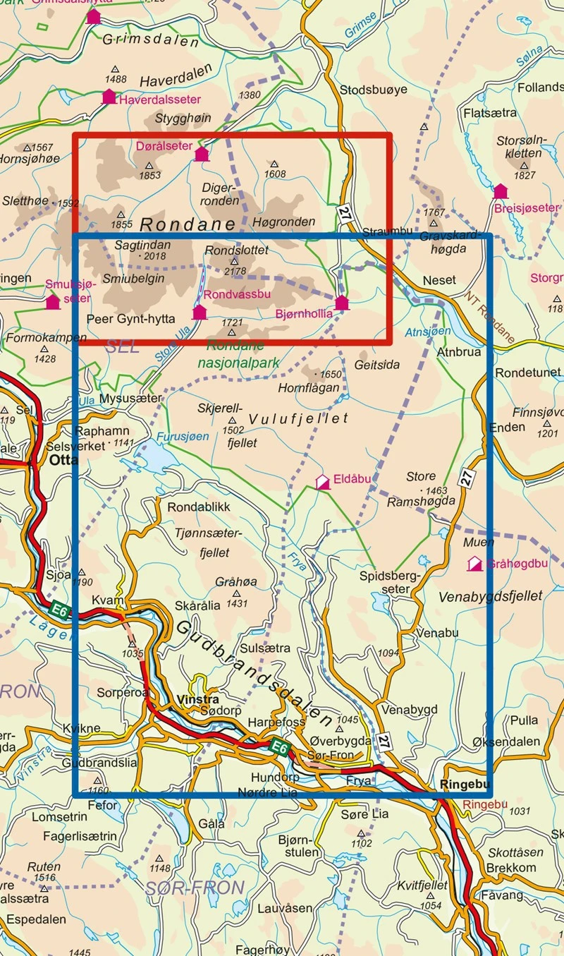 Carte Rondane SÞr, de randonnée et de plein air du Rondane sud. La carte couvre le secteur de Rondvassbu et Vinstra. Ces lieux sont indiqués sur la carte : AtnsjÞen, Enden, Frya, Gudbrandsdalen, Hundorp, Kvam, Kvamsfjellet, Ringebu, Rondane nasjonalpark, Rondslottet, Venabygd, Venabygdsfjellet, Vinstra.