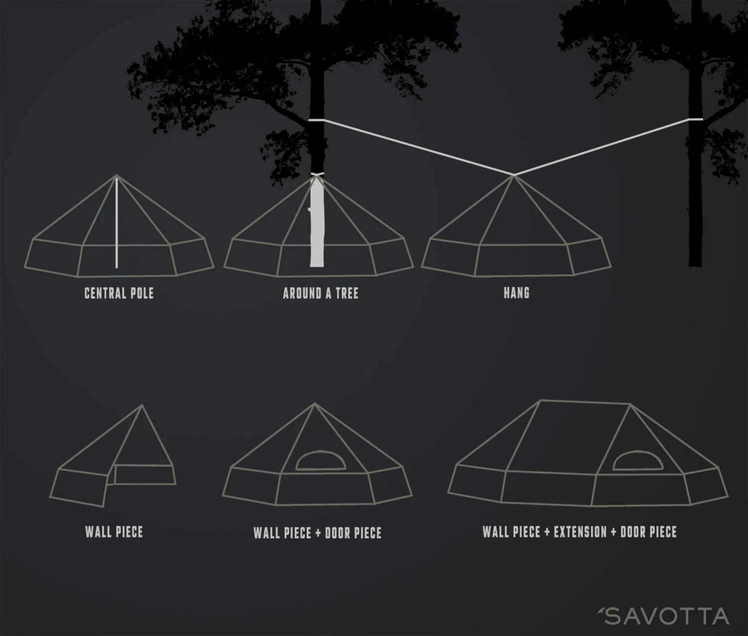 - Wall Piece + Door Piece : le Wall Piece peut ĂȘtre installĂ© en complĂ©ment de la Door PiĂšce, ce qui permet de former une tente complĂšte.