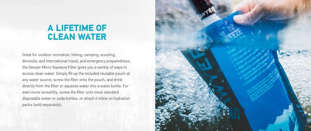 Le Micro Squeeze de Sawyer est un filtre Ă eau comprenant un filtre, une paille, une seringue de nettoyage et une bouteille dâeau pliable dâune capacitĂ© dâ1 litre. Ce filtre a eau avec membrane bĂ©nĂ©ficie dâune filtration rapide pour un usage immĂ©diat. La poche Ă eau permet aussi le stockage dâune petite quantitĂ© dâeau. Le Micro Squeeze peut-ĂȘtre facilement vissĂ© sur une bouteille dâeau conventionnelle ce qui le rend trĂšs polyvalent.