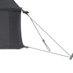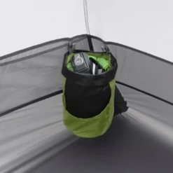 La housse de rangement se décompose en plusieurs compartiments, afin de pouvoir séparer la chambre du double-toit lorsque celui-ci est ranger encore humide. Elle a été pensée pour servir de poches de rangement dans la tente et de « lightbar » plafonniÚre (à combiner avec sa lampe).