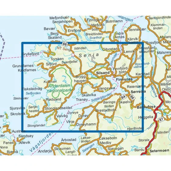 La carte Senja sĂžr au 1:150 000 couvre la partie Sud de l’Ăźle de Senja comprenant les lieux suivants : Gryllefjord, BlĂ„fjellet, DyrĂžyhamn, Ă nderdalen, Finnfjordbotn, SĂžrreisa, Finnsnes, Senja, Gibostad, Solbergfjorden, Leiknes, Kistefjellet, Stonglandseidet.