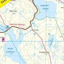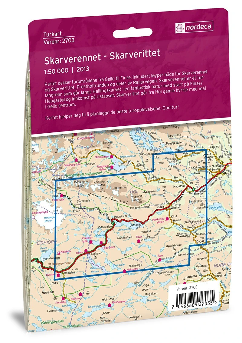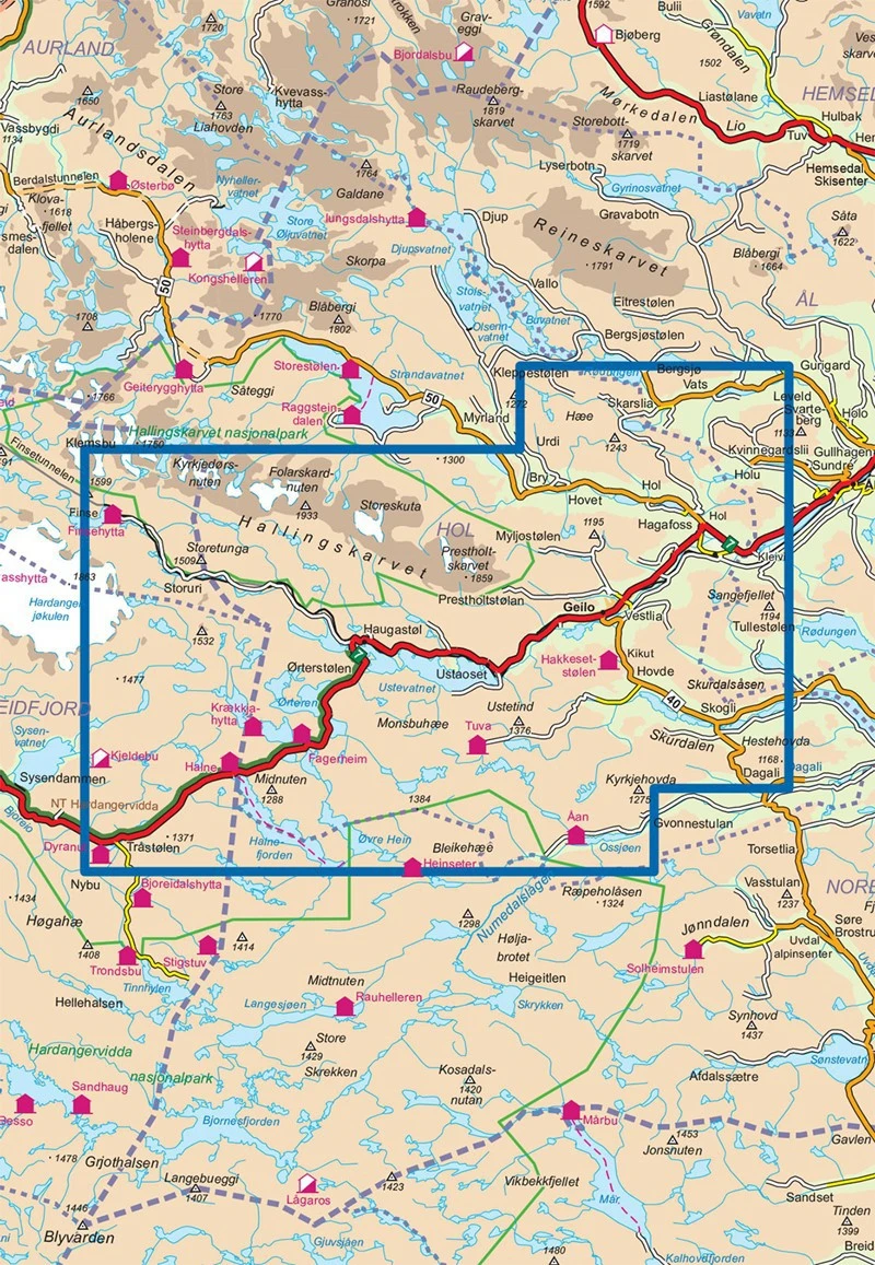 La carte du Skarverennet, en NorvĂšge couvre les lieux suivants : Dagali, Finse, Folarskardnuten, Geilo, Hallingskarvet, Hallingskarvet nasjonalpark, Halnefjorden, Hol, NumedalslĂ„gen, Ustevatnet, Vats. Echelle au 1:50 000. Sentiers et refuges indiquĂ©s sur la carte. Compatible avec le systĂšme GPS (WGS84 – grille UTM zone 34 – Euref89). Papier rĂ©sistant Ă l’humiditĂ©.