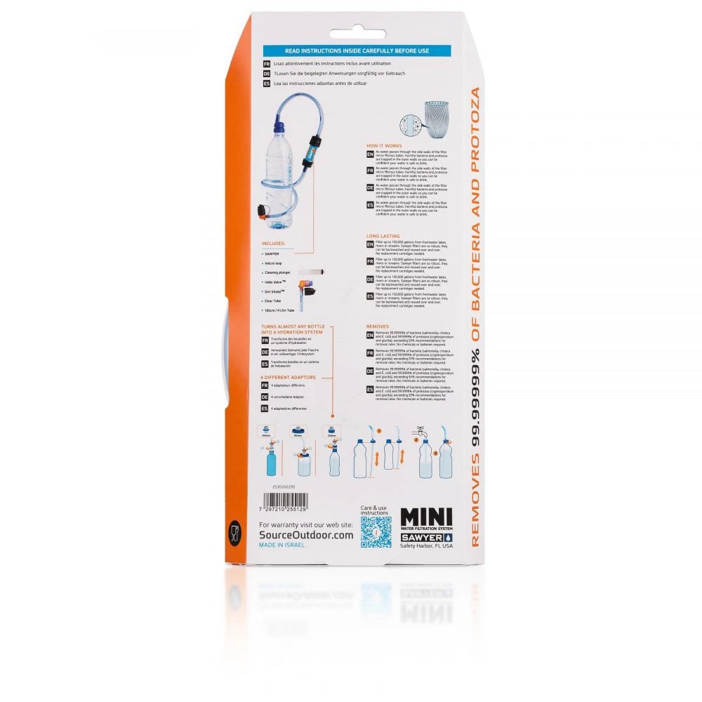 Fonctionnement : l’eau traverse le systĂšme de filtration micro-fibreux qui empeche les bactĂ©ries et les protozoaires de passer. Vous pourrez ainsi boire une eau saine. Le mini filtre filtre jusqu’Ă 300.000 litres d’eau. Le Sawyer est rĂ©sistant et peut-ĂȘtre lavĂ© : il ne nĂ©cessite aucune cartouche de remplacement.