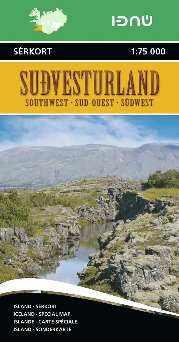 La carte Sudvesturland au 1 :75 000 couvre une petite partie du sud-ouest de lâIslande dĂ©limitĂ©e Ă lâest par Selfoss et au nord par Akranes et Hvalfjörður Fjord. RĂ©gion de la capitale de ReykjavĂk. Informations dĂ©taillĂ©es sur les pistes, les routes et les chemins de randonnĂ©e de la rĂ©gion. Carte spĂ©ciale Ă©ditĂ©e par Ferdakort, sĂ©rie Serkort.