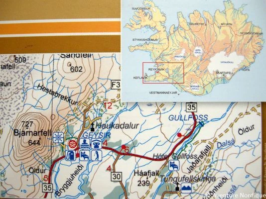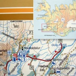 The Golden Circle : Gullfoss – Geysir – Þingvellir. La carte Ferdakort, série Sérkort contient des photos et des informations sur les principaux sites touristiques. Cette carte donne des renseignements sur les routes, les distances et les services proposés aux voyageurs en cours de route.
