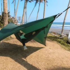 Le Lightest Tarp de Ticket To The Moon est une bĂąche de protection ultra-lĂ©gĂšre qui sâinstalle facilement au-dessus de son hamac pour le protĂ©ger. En Silnylon ripstop de 20 deniers, la toile est solide et rĂ©siste Ă une colonne dâeau de 2000 millimĂštres.