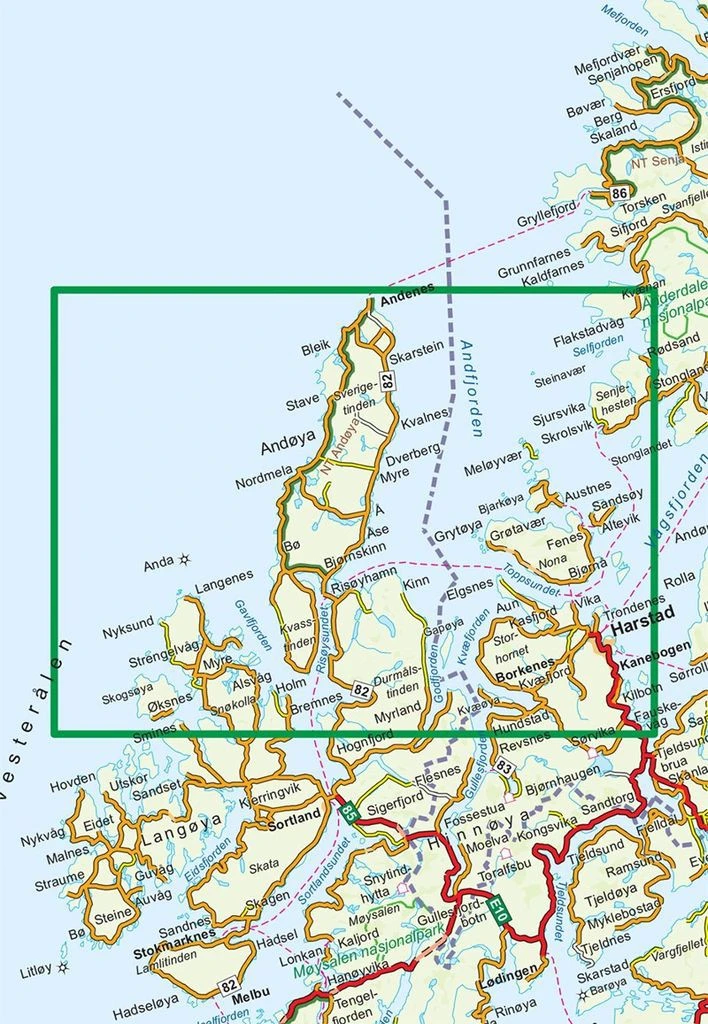 Carte de randonnée et de plein air du nord de l’Archipel des Vesterålen. Cette zone couvre le nord de l’île d’Hinnøya et l’île d’Andøya. Elle permet de visualiser les villes d’Andenes, de Myre, de Borkenes et d’Harstad. Compatible avec un GPS. Papier résistant à l’humidité.